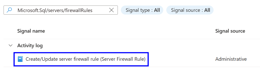 Under Condition, click See all signals, search for Create or Update SQL Server Firewall Rule, and select the signal.