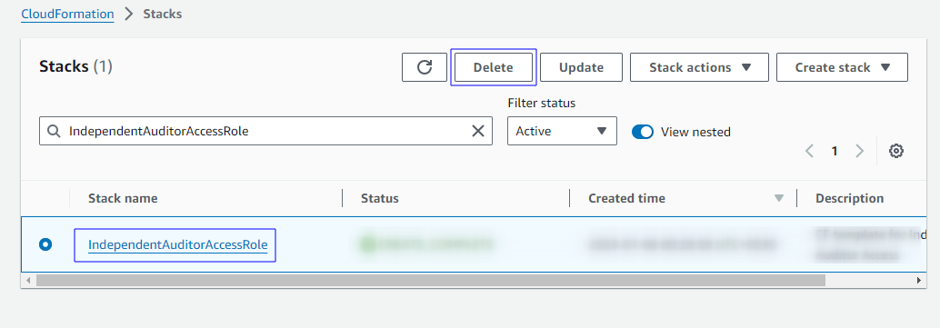 Serach for the “IndependentAuditorAccessRole” stack, Select the stack and click on delete.