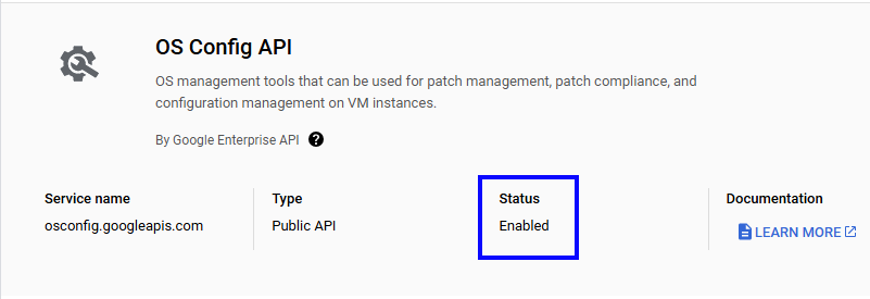 gcloud services listEnsure osconfig.googleapis.com is listed.