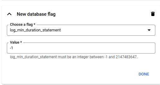 If the log_min_duration_statement flag is not already set, click Add item, select the flag from the dropdown menu, and set its value to -1.