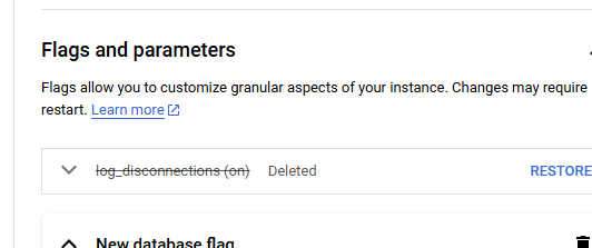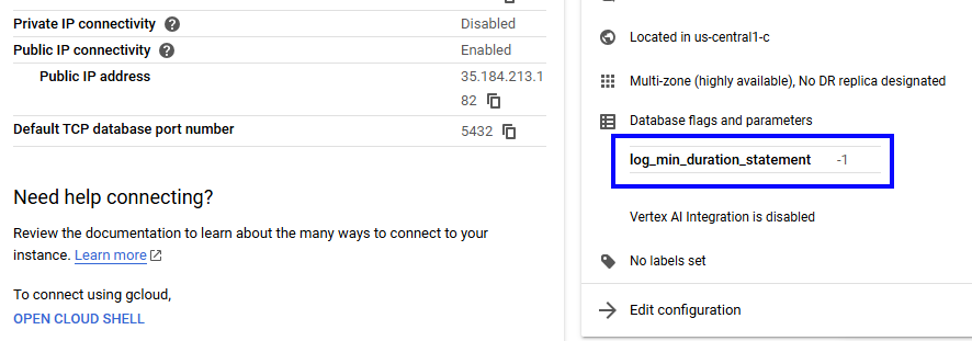 gcloud sql instances describe [INSTANCE_NAME] --format=json | jq '.settings.databaseFlags[] | select(.name=="log_min_duration_statement")|.value'Remediation Steps: