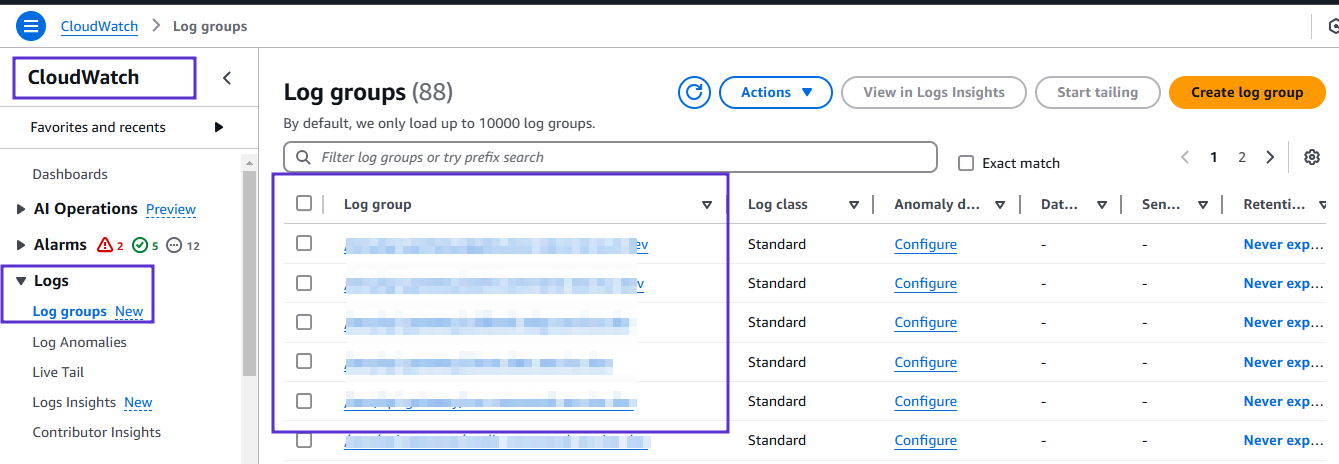 Navigate to CloudWatch Logs: AWS CloudWatch Console.