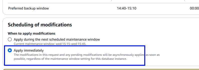 Select Apply Immediately or schedule the changes during the next maintenance window.