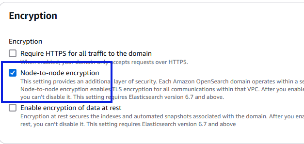 Performance Impact: While node-to-node encryption is designed to be efficient, monitor the cluster’s performance after enabling it to ensure it meets your performance requirements, particularly for large clusters with high data throughput.