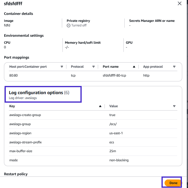 The output should contain the logConfiguration section, where the logDriver is set to awslogs. Example output: