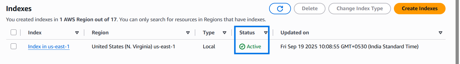 In the Resource Explorer Console, verify that indexes have been created by checking the Index Status.