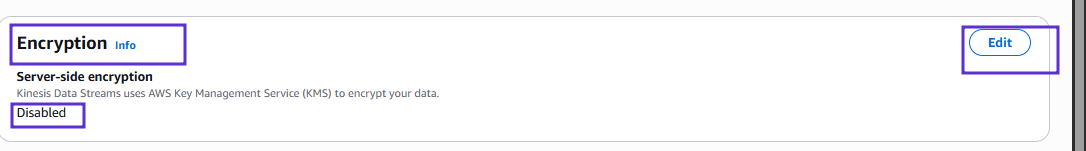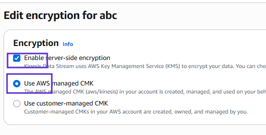 aws kinesis start-stream-encryption --stream-name <stream-name> --encryption-type KMS --key-id <kms-key-id>To verify the encryption status after enabling it, run: