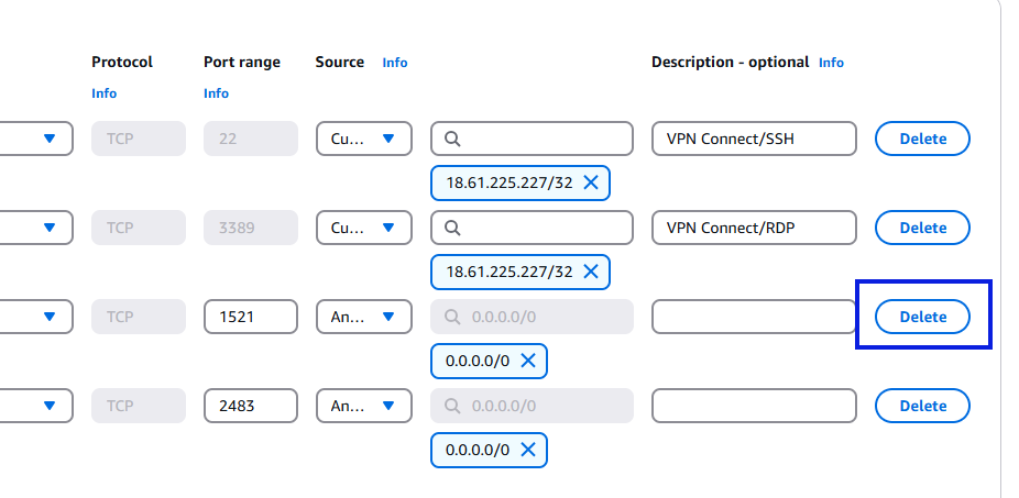aws ec2 revoke-security-group-ingress --group-id <group-id> --protocol tcp --port 1521 --cidr 0.0.0.0/0 aws ec2 revoke-security-group-ingress --group-id <group-id> --protocol tcp --port 2483 --cidr 0.0.0.0/0 aws ec2 revoke-security-group-ingress --group-id <group-id> --protocol tcp --port 2484 --cidr 0.0.0.0/0