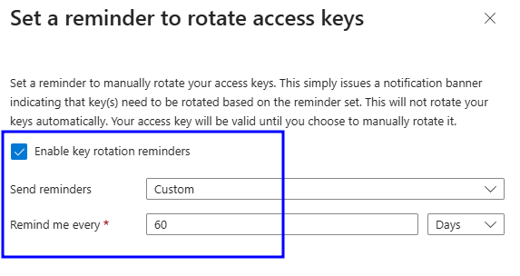 Enable key rotation reminder and toggle it on. Select the reminder interval (30, 60, or 90 days).