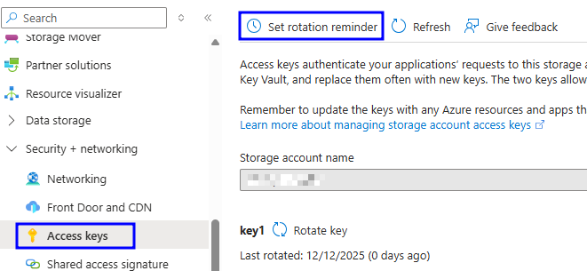 Under the Security + Networking, select Access keys. Select the set rotation reminder.